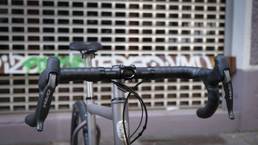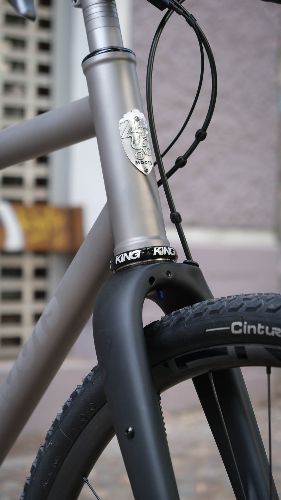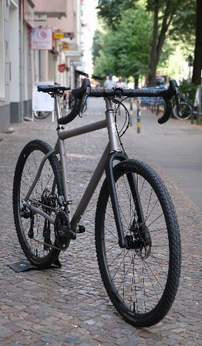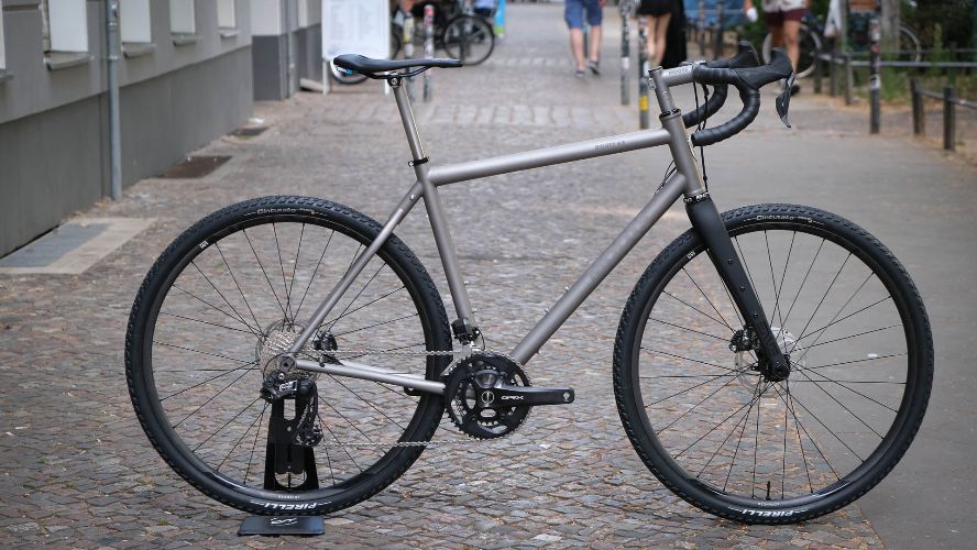 | Zusätzliche Angaben | Gravelbike Moots Routt 45, Etched Logo, Jubiläumsemblem am Steuerrohr, höchstwertige Komponenten (Titanrahmen, -Sattelstütze, -Vorderbau, Shimano GRX Di2, Chris King Steuersatz, SON-Nabendynamo, ENVE-Carbongabel etc.) |